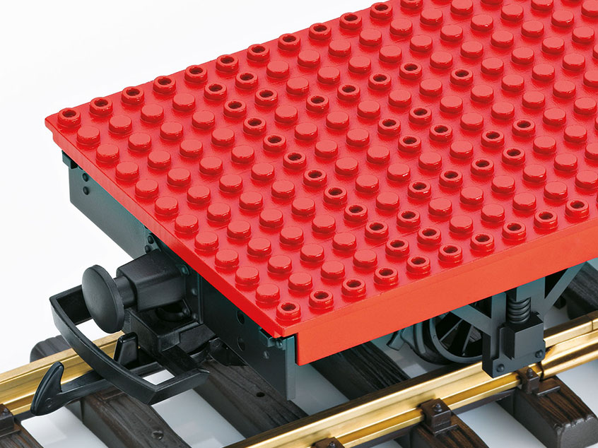 - Este set de inicio contiene una locomotora de vapor, dos vagones planos con sistema de bloques de construcción y 30 bloques de construcción.
