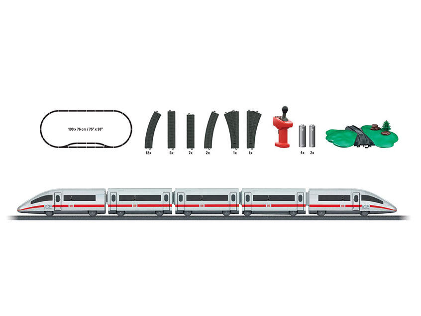 El conjunto tiene 11 tramos de vía de plástico curvo (R1), 7 tramos de vía de plástico recto (longitud 171,7 mm / 6-3 / 4 "), 5 tramos de vía de plástico recto (longitud 188,3 mm / 7-13 / 32 "), 2 secciones de vía de plástico curvo (curva de desvío), 1 desvío a la izquierda, 1 desvío a la derecha.